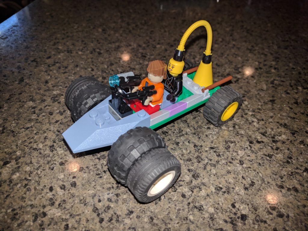 Big Wheeler has two wheels in the front because it needs two extra wheels. The person in the back is getting ideas from the brain giver.